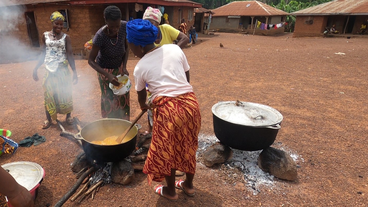 👩🏿🍳 Für gemeinschaftliche Aufgaben ist es deshalb üblich, dass auch die Gemeinschaft für Verpflegung sorgt. Heute gibt es Reis mit einer Sauce aus Erdnüssen und Ziegenfleisch.