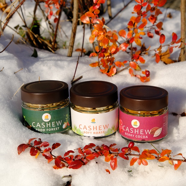Für Eure Mitarbeiterinnen, Kollegen, Partner und Kunden ein Weihnachtspaket mit köstlichen Sorten Cashews, das die bunte Üppigkeit der Nahrungswälder einfängt, die wir in Afrika pflanzen.