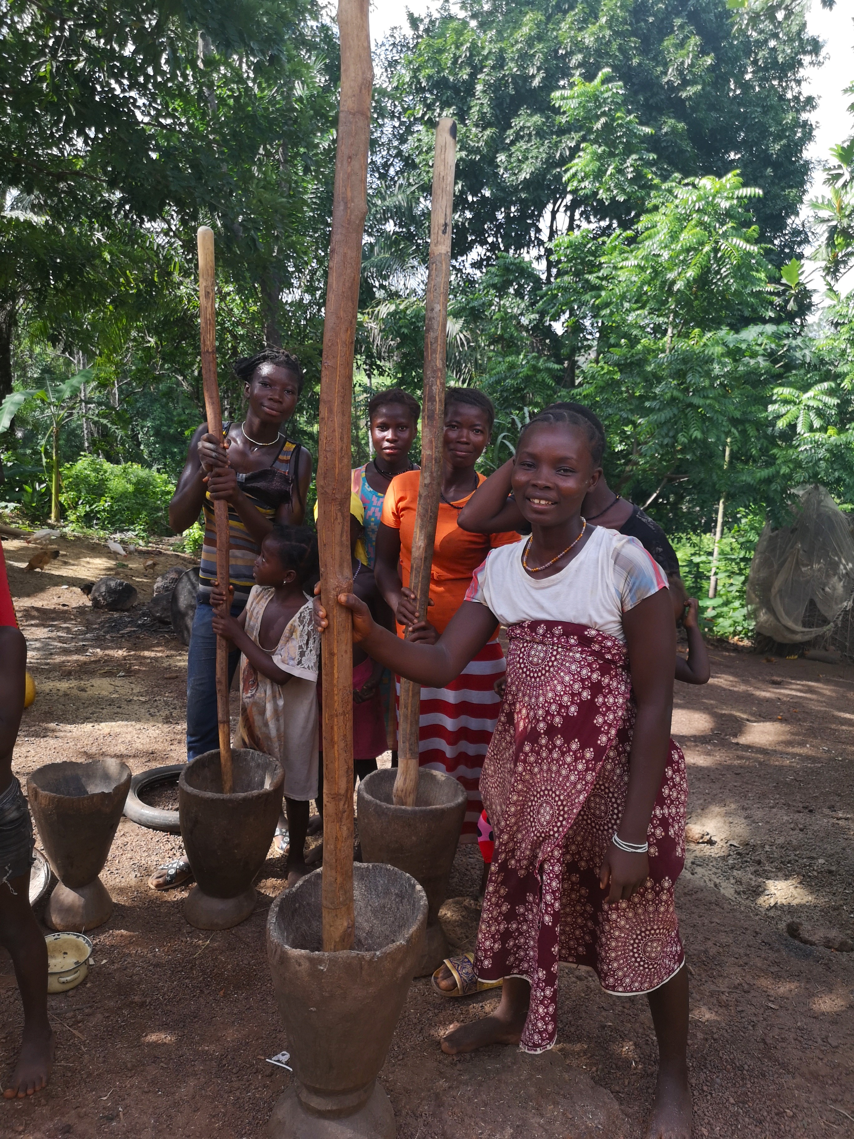 Wenn ich mich in unserer Küche so umschaue, sehe ich eine Kaffeemaschine, einen Mixer, einen Eierkocher (Ja, ich gestehe, ich hab so was, auch wenn es echt albern ist 😅), einen Herd und einiges mehr. Und ich habe einen Mörser zum Zerkleinern von Gewürzen und Samen, Zubereitung von Pesto. Das im Prinzip gleiche Gerät ist das mit Abstand wichtigste Utensil in unseren Partnerdörfern in Sierra Leone, nur ist es in groß ein echtes Multitalent.